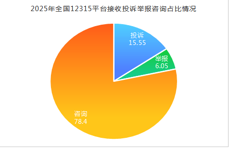 2025年,12315市场监视办理赞扬举报办公室通过全国12315平台领受征询8154件,此中涉及市场监管类的为214件,占征询总量的2。62%;非市场监管类的为4530件,占征询总量的55。56%;消费学问征询为3410件,占征询总量的41。82%。涉及市场监管系统营业征询的次要内容为:收集买卖监管、商品买卖市场监管、办事消费监管等内容。非市场监管类征询涉及的次要部分为:住建、卫健、银保、、劳动、邮政、工信、热力等部分和响应的营业。